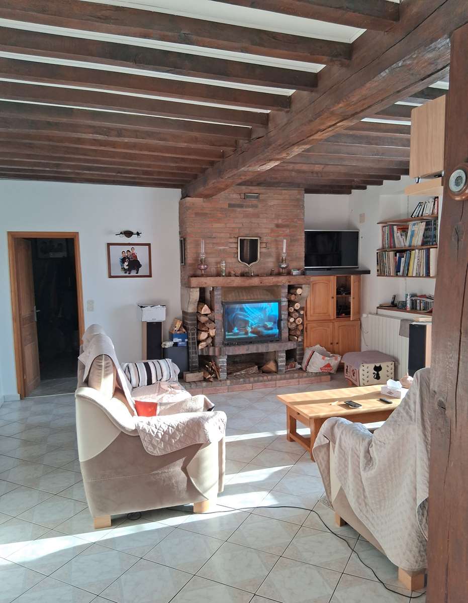 Cuisine anénagée donnant sur pièce de vie (cheminée insert et porte fenêtre donnant sur terrasse), chambre avec dressing, salle d'eau (douche à l'italienne), WC, cellier