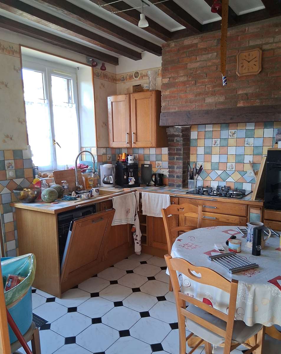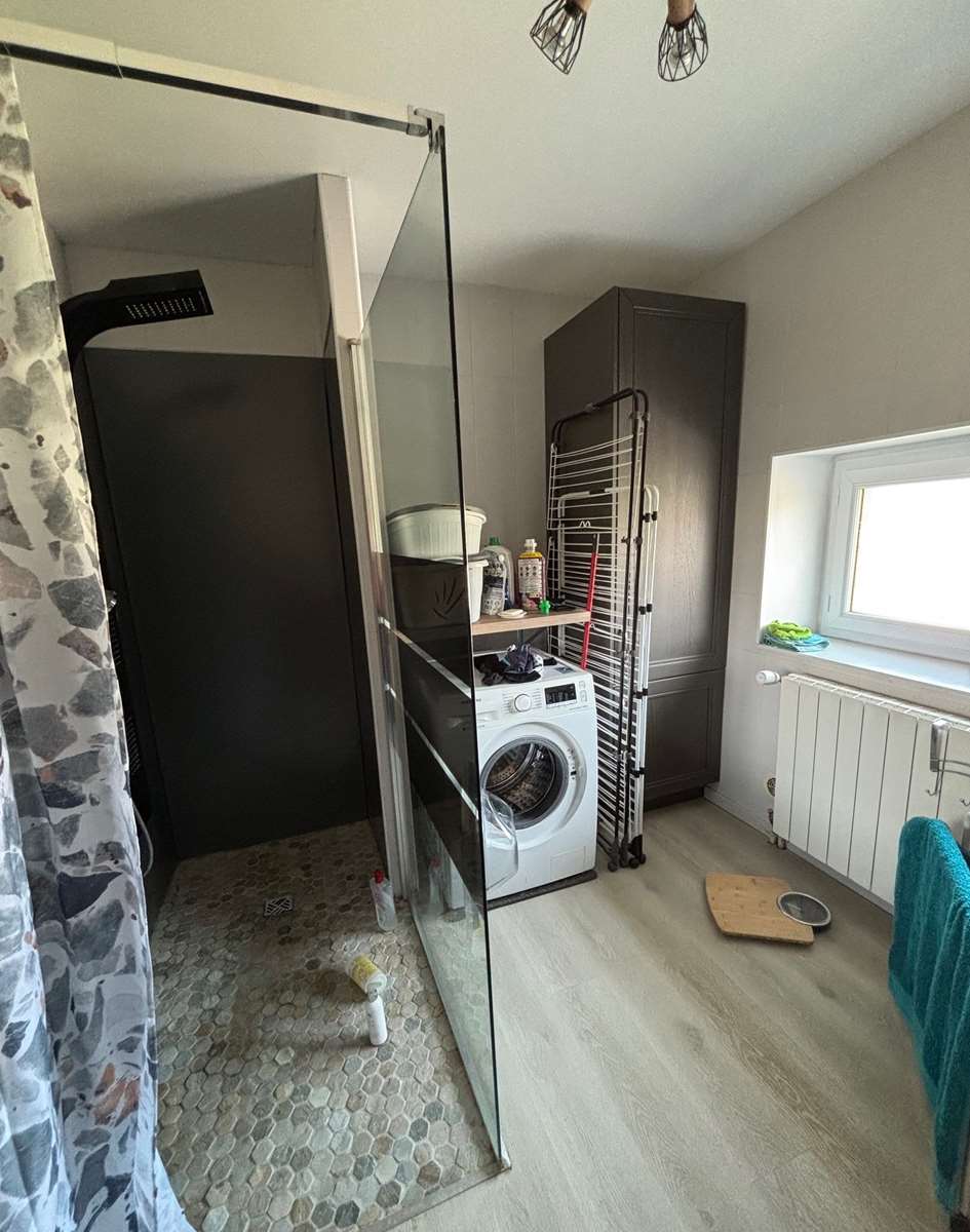 Cuisine anénagée donnant sur pièce de vie (cheminée insert et porte fenêtre donnant sur terrasse), chambre avec dressing, salle d'eau (douche à l'italienne), WC, cellier