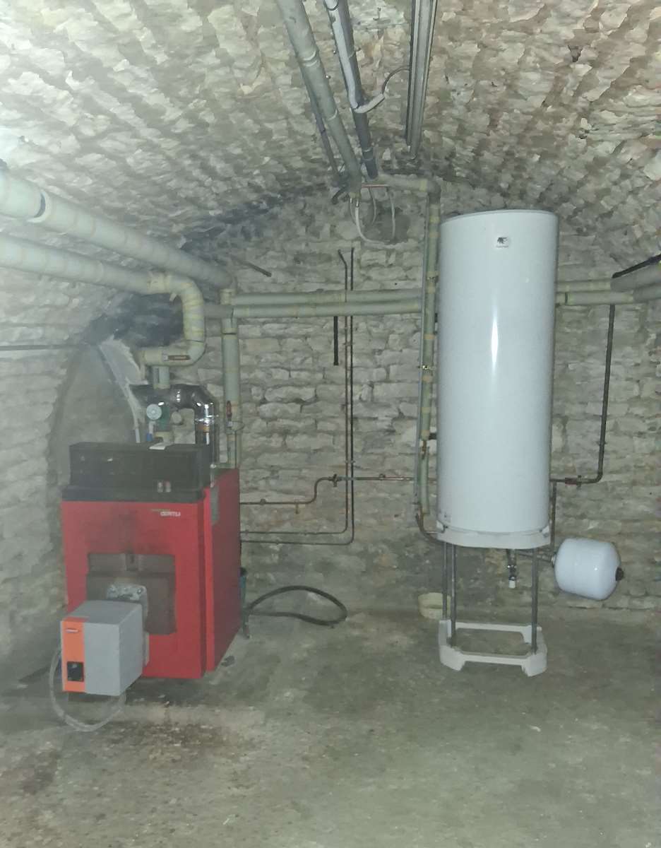 Maison ancienne pierres apparentes : entrée, séjour (cheminée) donnant sur terrasse, cuisine aménagée, chambre en parquet, salle d'eau, WC, débarras. Etage : 3 chambres, salle d'eau, WC. Garage avec grenier, chaufferie (chauffage central fuel) cave.